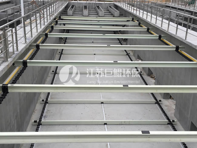 采用上滑轨非金属托架系统的刮泥机,通过托架系统的使用,大幅降低了链节、链轮的受力,通过托架和水中浮力的作用,驱动电机的负荷也大幅减低,使更低的电力消耗得以实现。通过托架系统和主副双轴的使用,设计更宽更长的刮泥系统成为可能。宽度可达10米,长度可延伸到100米。
