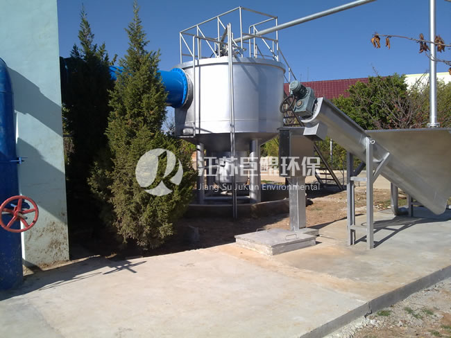 旋流沉砂池有平底园池和锥底园池两种,池底中央有储砂斗,池内设有除砂机,除砂机由驱动装置、搅拌机、吸砂系统等组成,与后续砂水分离器等配套组成成套除砂处理设备,含砂废水在经过平而直的进水渠后,进水紊流减至最低,进水渠末端是一个能产生附壁效应的斜坡,可使部分已沉降于渠道内的砂粒顺坡进入沉砂池,进水口处设有一阻流板(只装在小型池内),使冲出于板上的水流下折到选区的底板上。轴流式搅拌机则将水流带向池中心,然后向上,由此形成一个涡形水流,较重的砂粒在靠近池中心的一个环形孔口落入集砂区,进入砂斗内的砂可用气提吸砂或泵外排,而较轻的有机物由于搅拌机对于水的剪切作用,将有机质与砂粒分离,最终随轴向流水体引向出水渠。