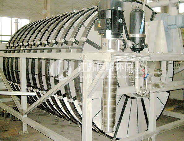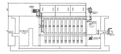 半浸式转盘微滤装置原理上是按转鼓过滤方式进行工作,过滤器是由一系列水平安装,可旋转的过滤转盘构成,转盘安装在中央管轴之上,最大水浸泡体积可达60%。污水从内向外穿流过不锈钢网,过滤后的清水从机械的端部流出。