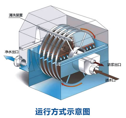 随着过滤时间的延长,筛网会被截留的悬浮物所覆盖, 导致过滤压差增大,在到达预先设置的最大压力差时,转盘开始缓慢旋转, 冲洗棒按一定节奏对过滤面上沉积悬浮物进行清理。冲洗水流溶解悬浮物,通过安装在设备内部的厚浆料斗将反冲洗水排出箱体。