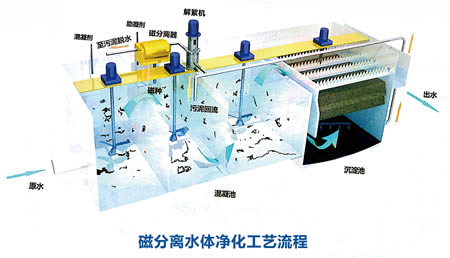 所谓磁混凝沉淀技术就是在普通的混凝沉淀工艺中同步加入磁粉,使之与污染物絮凝结合成一体,以加强混凝、絮凝的效果,使生成的絮体密度更大、更结实,从而达到高速沉降的目的。磁粉可以通过磁鼓回收循环使用。(磁混凝沉淀工艺流程见下图)