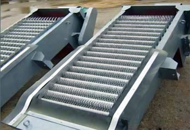 CF-Ⅰ型回转式固液分离机采用回转式,由一种特殊形状的犁形耙齿按一定的装配顺序和数量排列在横轴上,组成耙齿链,根据过水流量,装配成不同的间隙,安装在泵站或水处理系统的入口处,当驱动装置带动耙齿自下向上运动时,水中的杂物被耙齿捞起,液体则在栅隙中流过,设备转动到上部顶点后,耙齿链改变运动方向,由上向下运动,物料依靠自重从耙齿上自动脱落,当耙齿从反面转到设备底部时,又开始另一循环往复的连续运行,从而不断地从水中清捞杂物,达到固液分离的目的。