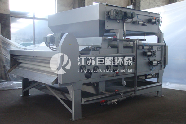 经过浓缩的污泥与一定浓度的絮凝剂在静、动态混合器中充分混合以后,污泥中的微小固体颗粒凝成体积较大的絮状团块,同时分离出自由水,絮凝后的污泥被输送到浓缩重力脱水的滤带上,在重力的作用下自由水被分离,形成不流动状态的污泥,然后夹持在上下两条网带之间,经过楔形预压区、低压区和高压区由小到大的挤压力、剪切力作用下,逐步挤压污泥,以达到最大程度的泥、水分离,最后形成滤饼排出。